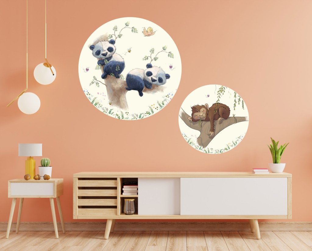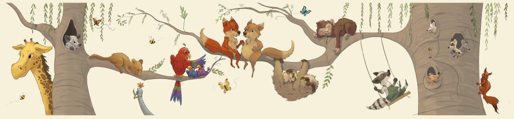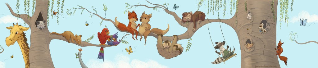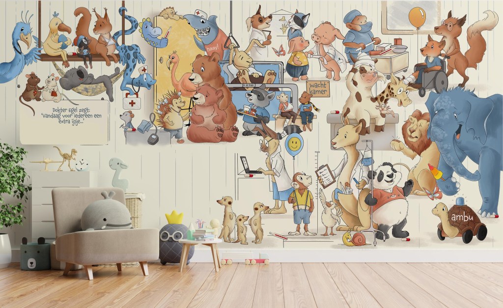 Behang, wandbekleding of wandplaten. Leontine tekent, schildert plakt het, of hangt het kunstwerk op. Jouw idee uitgewerkt in een uniek illustratie voor de kinderkamer, babykamer, bedrijf of afdeling? Er is veel mogelijk. Het fijne van wandbekleding is dat het heel gemakkelijk aan te brengen is en ook verplaatst kan worden.